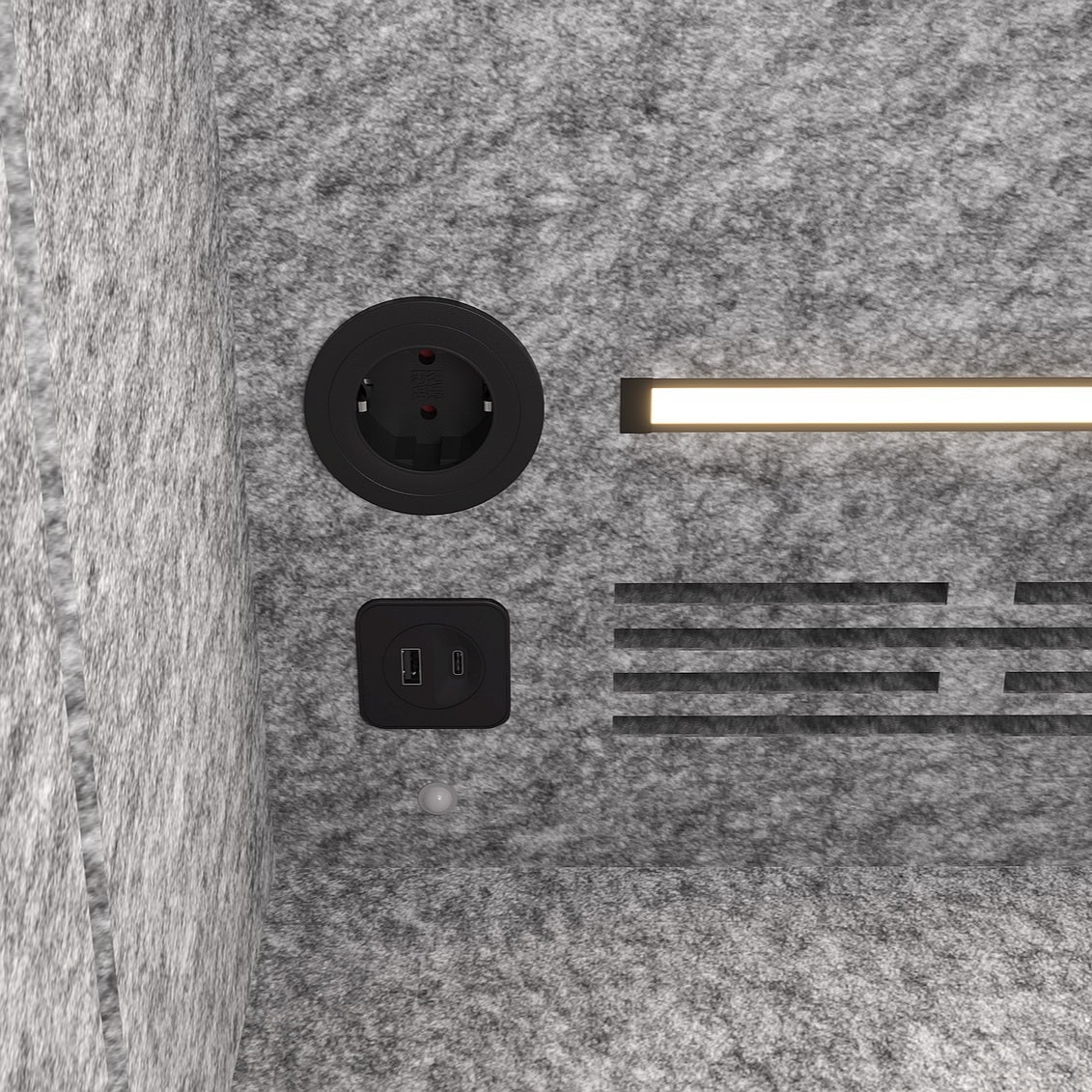 Die Telefonbox ist mit einem automatisch per Bewegungssensor gesteuerten Lüfter ausgestattet – dieser hat eine Leistung von 82,7 m³/h (nominell), was für kurze Telefonate und Videocall ausreichend ist.