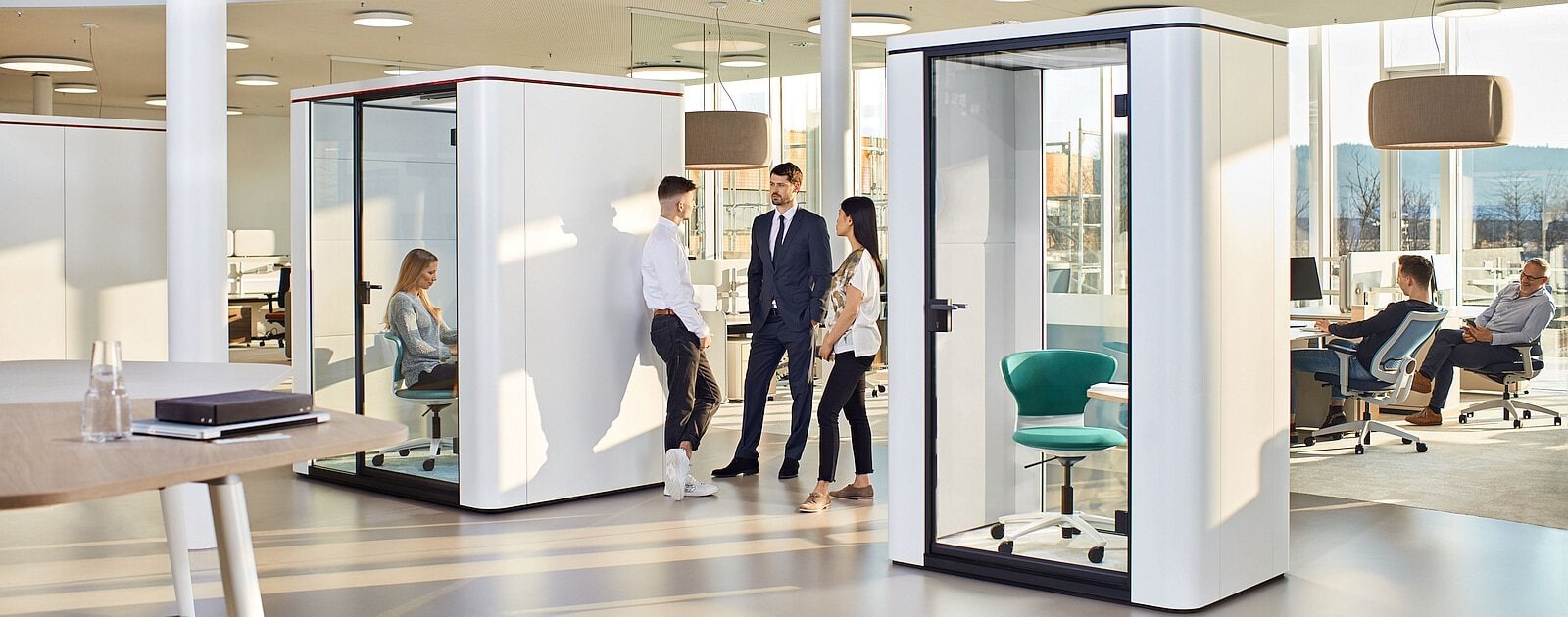 La famille de produits se:cube comprend différentes tailles, des postes de travail individuels compacts aux salles de réunion et de conférence spacieuses :